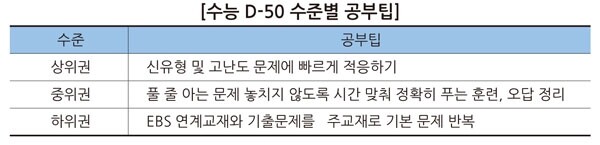 수능이 50일 남은 상황에서는 아무래도 취약 부분을 집중 공략하기 마련이다. 평소 자주 틀리는 수학 영역이나, 비교적 점수를 올리기 수월한 탐구 영역 학습에 비중을 두는 경우가 많다. 하지만 취약 부분 중심으로 공부를 하다 보면 다른 부분에는 소홀해져 평소에 잘 하던 영역에서도 실력 발휘를 못하는 경우가 있다. 국어, 영어는 감을 읽지 않도록 지문 1~2개씩이라도 꾸준히 풀고, 전체적으로 일주일에 한 번 정도는 실전 연습을 하도록 하자.