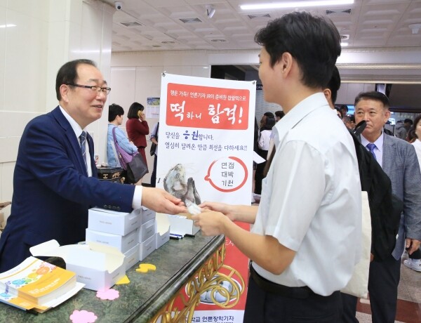 [대학저널 이승환 기자] 중원대학교(총장 김두년)는 27일부터 28일까지 이틀간 진행되는 2020학년도 수시모집 면접·실기고사 기간 내 본관 로비에서 ‘너의 합격을 응원해’ 합격기원 찹쌀떡 나눔 행사를 가졌다.