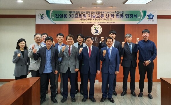 용인송담대와 동산콘크리트산업은 이번 협약을 통해 LINC+사업(산학협력고도화형)의 산학공동기술개발 지원을 통해 개발한 건설용 대형3D프린터(3D조형과 윤성현 교수)를 이용한 건설용 3D프린터 기술개발 및 교육, 인적 교류 등 상호협력을 강화해 나가기로 하였다.