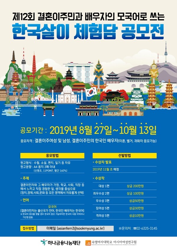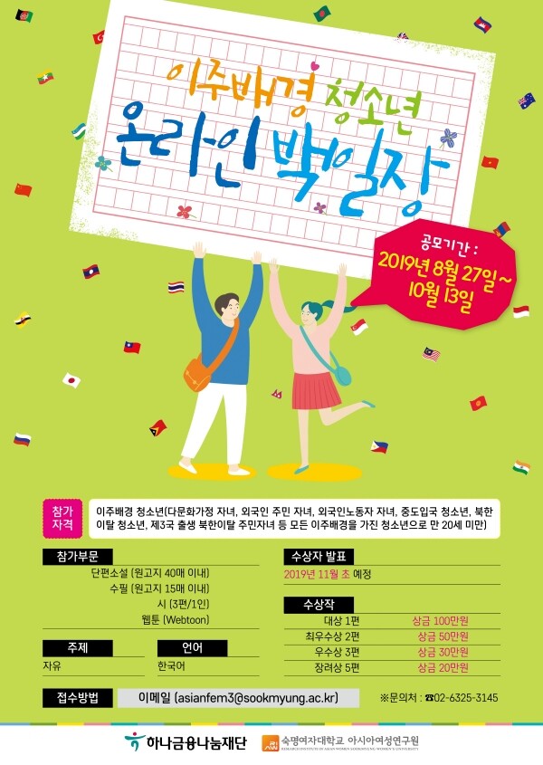[대학저널 백두산 기자] 숙명여자대학교(총장 강정애) 아시아여성연구원(원장 박소진)이 ‘제12회 결혼이주민과 배우자의 모국어로 쓰는 한국살이 체험담 공모전’과 ‘제2회 이주배경 청소년 온라인 백일장’을 개최한다. 접수는 오는 10월 13일까지다.