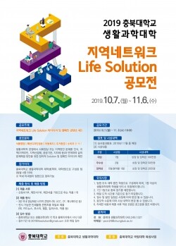 [대학저널 이승환 기자] 충북대학교(총장 김수갑) 생활과학대학은 오는 11월 6일까지 국립대학 육성사업의 일환으로 ‘2019 지역네트워크 Life Solution 공모전’을 개최하고 관련 아이디어 및 캠페인 콘텐츠를 공모한다.