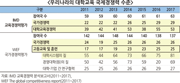 대학 경쟁력, 나아가 국가 경쟁력도 이에 편승해 줄곧 하락세를 면치 못하고 있다. IMD(국제경영개발연구원) 교육경쟁력 분석보고서에 따르면, 한국의 대학교육경쟁력은 2011년 39위에서 2017년 53위로 14계단 하락했고 같은 기간 국가경쟁력 또한 22위에서 29위까지 떨어졌다.