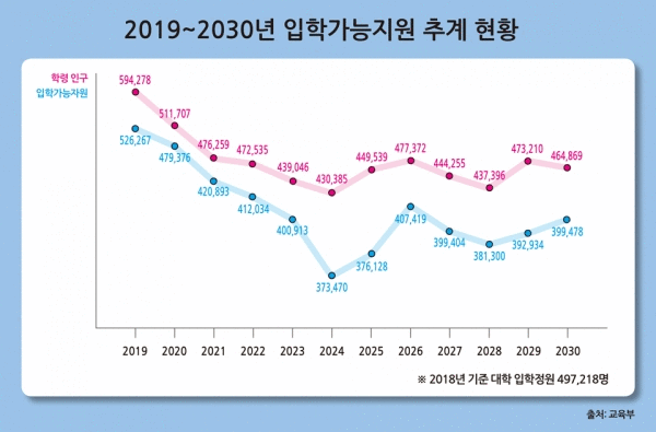 학령인구 감소는 대학이 직면한 초대형 악재다. 2020년 대입 가능자원은 올해보다 4만 6,000여 명 줄어든 47만 9,376명. 대입정원인 49만 7,218명(2018년 기준)보다 1만 7,800여 명 적다.