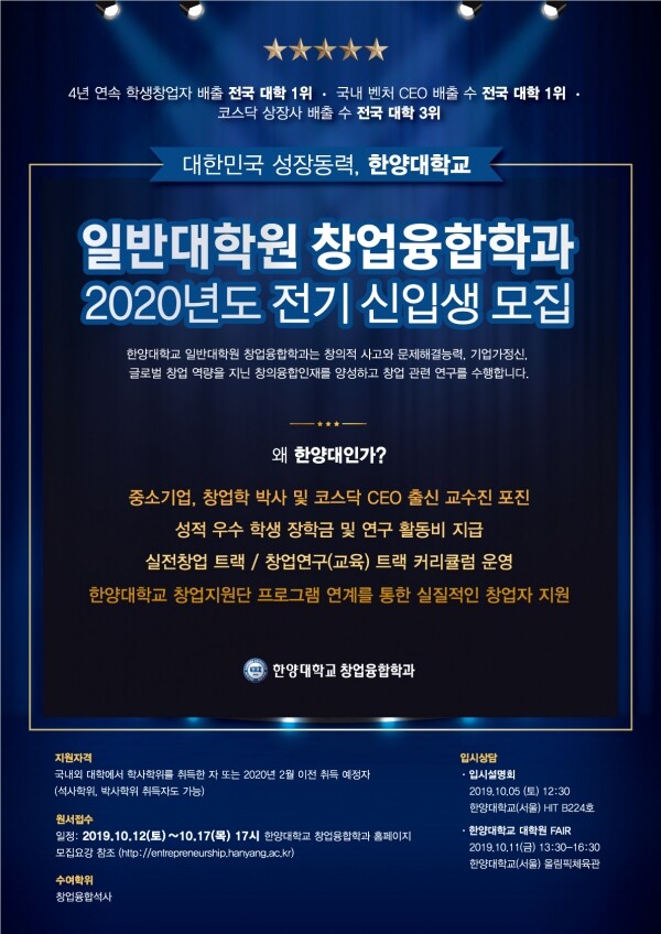 [대학저널 신효송 기자] 한양대학교(총장 김우승)가 오는 17일까지 일반대학원 창업융합학과 2020학년도 전기 신입생을 모집한다.