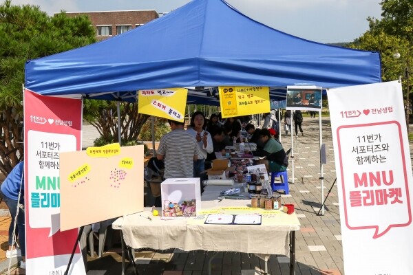 이날 행사는 11번가 서포터스 학생들이 전남 생산자 협동조합(이사장 윤준웅) 상품을 받아 전남지역 우수상품들을 부스와 SNS 홍보를 통해 교직원과 학생, 지역 거주민들에게 알리고자 마련됐다.
