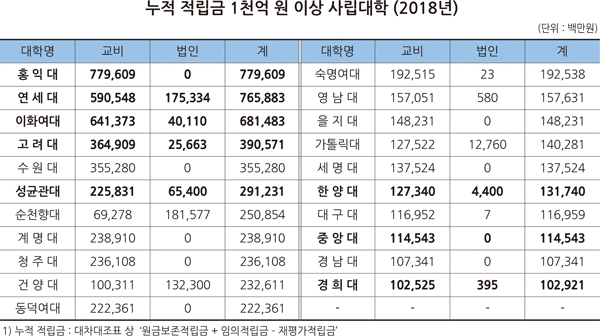 2018년 교비회계와 법인회계 합산 누적 적립금이 가장 많은 사립대는 홍익대로 7,796억 원을 보유하고 있었다. 다음으로 연세대 7,659억 원, 이화여대 6,815억 원, 고려대 3,906억 원이었다. 누적 적립금 1,000억 원 이상인 21개 대학에 서울지역 대규모 사립대 8교가 포함돼 있다.