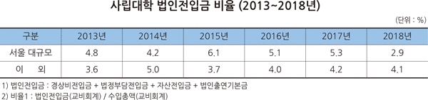 수입 재원의 편중이 심각하지만, 법인책무성 지표는 오히려 낮았다. 2018년 교비회계 수입총액 대비 법인전입금 비율이 서울지역 대규모 사립대학은 2.9%지만, 이외 사립대학은 4.1%였다.