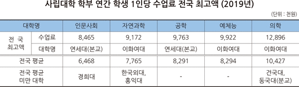 특히 인문사회계열과 공학계열은 연세대(각각 847만 원, 976만 원), 자연과학・예체능・의학계열은 이화여대(각각 917만 원, 992만 원, 1,290만 원) 수업료가 전국에서 가장 비쌌다.