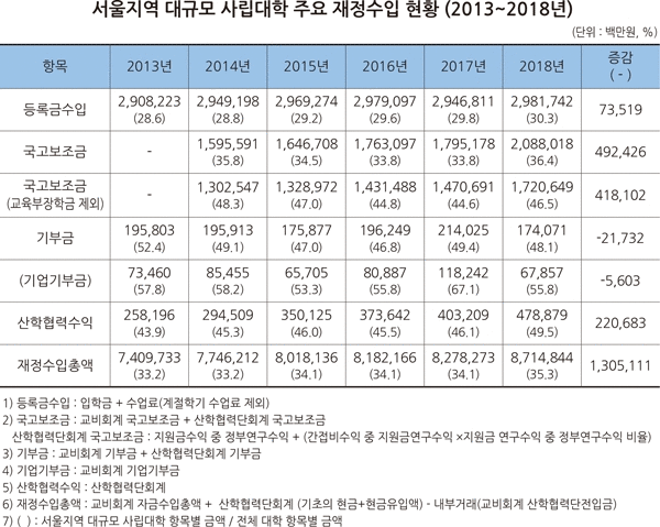 등록금 장기동결과 구조조정 여파에도 서울지역 대규모 사립대 등록금 수입은 2013년 2조 9,082억 원에서 2018년 2조 9,817억 원으로 5년새 735억 원 증가했다. 이외 사립대는 같은 기간 3,904억 원 감소했다.