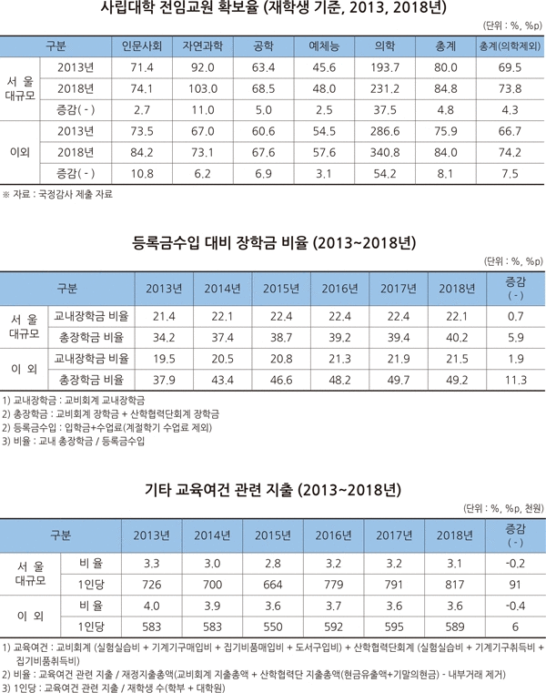 2018년 전임교원 확보율은 서울지역 대규모 사립대가 84.8%, 타 사립대가 84%로 미미한 차이를 보였다. 의학계열을 제외하면 각각 73.8%, 74.2%로 오히려 타 사립대가 높았다.