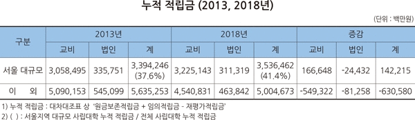 서울지역 대규모 사립대는 적립금도 꾸준히 늘린 것으로 나타났다. 2013년 대비 1,422억 원 증가했다. 같은 기간 타 사립대는 6,306억 원 감소했다. 전체 사립대 적립금 8조 5,411억 원 가운데 41.4%인 3조 5,365억 원이 서울지역 대규모 사립대의 적립금 규모다.
