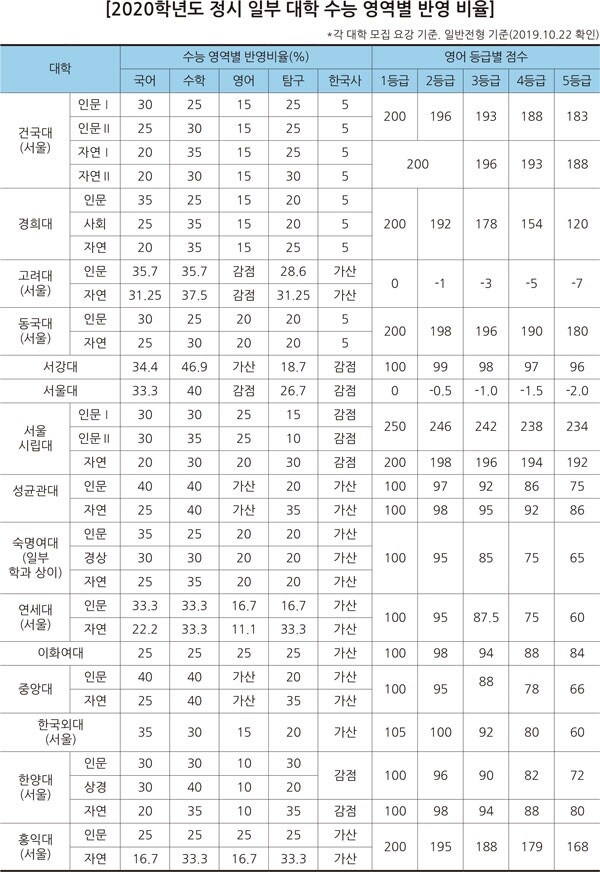 고려대, 서강대, 서울대, 성균관대, 중앙대 등은 국어, 수학, 탐구 3개 영역 반영 비율의 합이 100%로 수능 총점을 산출한 후 영어 등급에 따라 가산 혹은 감산하는 방식으로 실질 영향력을 낮추었다. 반면, 서울시립대, 연세대, 홍익대 등은 타 대학보다 영어 반영 비율이 높아, 영어 영향력이 클 것으로 보인다.