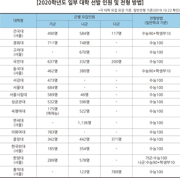 전형방법은 대부분 수능100% 선발이지만, 일부 학생부를 활용하는 대학이 있으니 눈 여겨 보자. 건국대, 동국대 등은 교과 성적을 반영하고, 한양대의 경우 가군은 수능100% 전형이지만, 나군은 수능90%+학생부10% 선발로 각기 다르다.