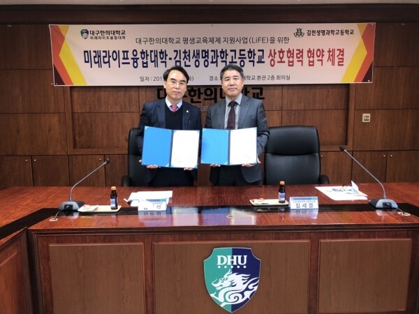 [대학저널 신효송 기자] 대구한의대학교(총장 변창훈) 미래라이프융합대학이 지난 5일 대학본관 대회의실에서 지역사회 평생교육의 진흥을 위해 김천생명과학고등학교(교장 김세경)와 협약을 체결했다.