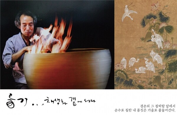 이번 전시회에서 이 옹기장은 찻잔, 주전자, 항아리 등 따뜻하고 소박한 아름다움을 간직한 자연의 그릇 50여점을 내놓았다. 아내 이 작가는 ‘장생도’를 비롯해 ‘일월오봉도’ ‘금강산도’ ‘모란도’ ‘삼일절’ 등 전통 채색화 20여점을 선보인다.