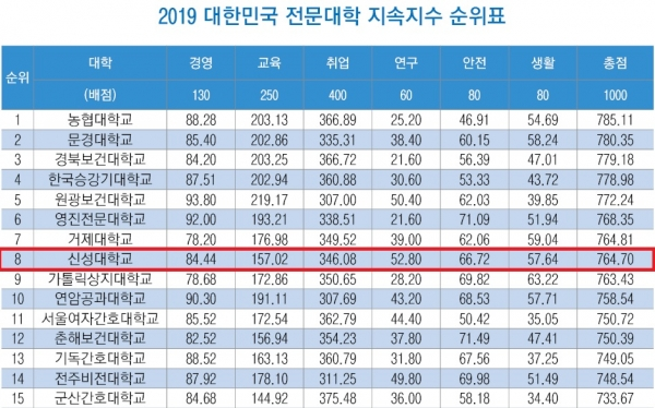 신성대는 지난해 종합순위 2위에 이어 올해는 8위에 올라 3년 연속으로 최상위권 대학으로 평가를 받았으며, 대전‧세종‧충청권 대학 중 부동의 1위를 차지했다.