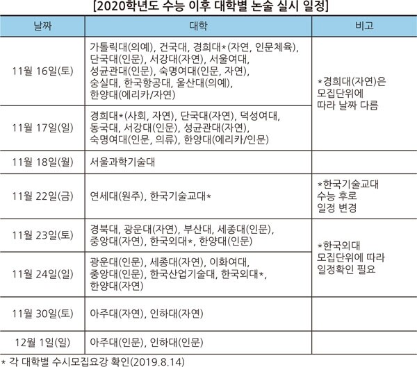 수능 직후 주말인 16일, 17일부터 건국대, 경희대, 단국대, 동국대, 서강대, 성균관대, 서울여대, 숭실대 등에서 논술이 진행되고, 다음 주 토요일과 일요일에도 경북대, 부산대, 광운대, 세종대, 중앙대, 이화여대, 한국외대, 한양대 등의 논술이 예정돼 있다.