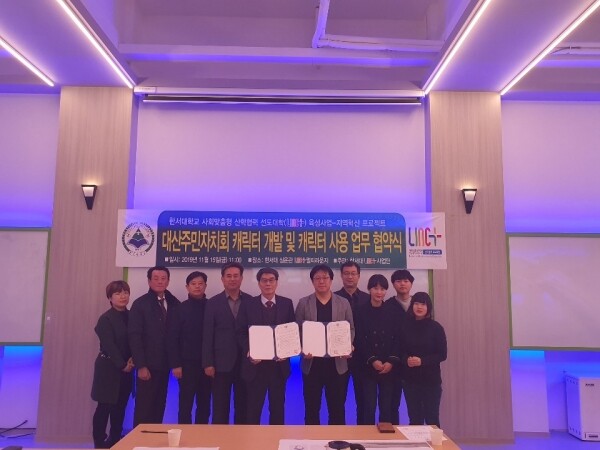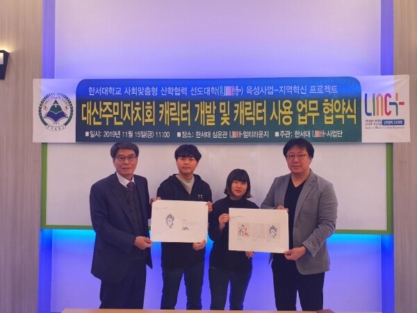 [대학저널 이승환 기자] 한서대학교(총장 함기선) LINC+ 사업단(단장 김현성 부총장)은 15일 심운관 LINC+ 멀티라운지에서 충남 서산시 대산읍 주민자치회와 지역협력 협약식을 갖고 지역사회 협력을 위한 캐릭터 개발 및 사용 협약을 체결했다.