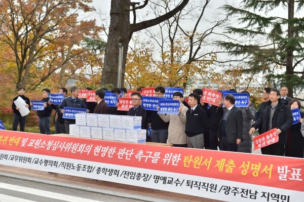 이날 성명서 발표를 마친 후 조선대 구성원들은 최근까지 약 2,500명이 서명한 탄원서와 각계각층에서 신임 총장의 조속한 취임과 안정적인 학사 운영을 촉구하는 성명발표문을 교육부 교원소청심사위원회에 전달했다.