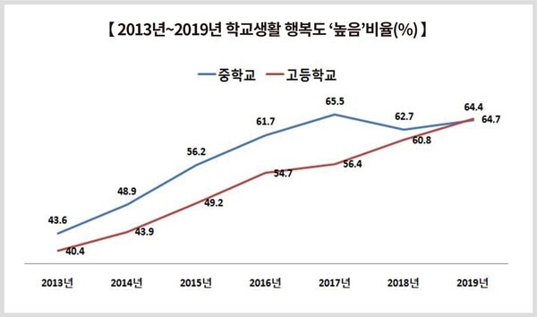 학교생활 행복도는 중·고등학교 모두 64% 이상으로 중·고등학생 간의 격차가 없어졌다. 64%는 2013년과 비교했을 때 중학교 20.8%p, 고등학교 24.3%p가 증가한 수치다.