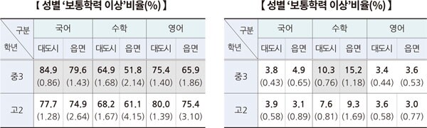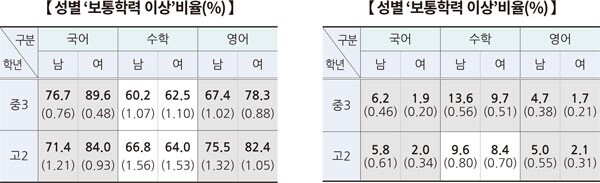이번 조사에서 성별 성취수준은 중·고등학교 모두 여학생이 전반적으로 남학생에 비해 학업성취도가 높은 것으로 나타났다. 보통학력 이상 비율은 여학생이 중·고등학교 모두 국어, 영어에서 남학생에 비해 높았고, 기초학력 미달의 경우는 남학생이 중학교 모든 교과와 고등학교 국어, 영어에서 여학생에 비해 높게 나타났다.