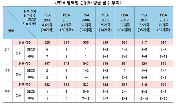 수치상으로 한국 학생들의 읽기, 수학, 과학 순위 모두 전체 79개국(OECD 37개국) 중 최상위권에는 속한다. 하지만 추이를 살펴보면 평균점수와 순위는 전반적으로 하락세다.