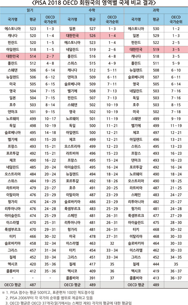OECD 국가 중 읽기는 에스토니아, 캐나다, 핀란드, 아일랜드 학생들이 한국보다 위에 자리했고 수학은 일본의 순위가 가장 높았다. 과학은 에스토니아, 일본, 핀란드 순이었다.