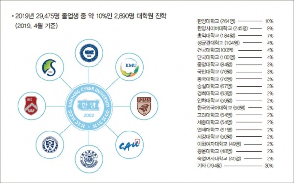 한양사이버대 졸업생들은 국내 유수의 명문대학원으로 활발하게 진학하고 있으며, 2019년을 기준으로 졸업생 대비 약 10%인 2,890명이 대학원에 진학했다. 이 중 가장 많이 진학한 대학원은 한양대학교 대학원으로 총 296명이 진학했으며, 전체의 10.2%를 차지했다. 이외에도 서울대학교(2명), 고려대학교(61명), 연세대학교(56명), 서강대학교(52명), 이화여자대학교(52명) 등 국내 유수 대학원의 진학률이 매우 높은 편이다. 또한 한양사이버대학원으로의 진학도 활발(248명)하여 한양사이버대학교에 진학하면, 대학원까지의 연계가 잘 돼 있다고 할 수 있다. 이는 한양사이버대의 체계적인 교육과정, 우수한 교수진, 엄정한 학사관리 등을 반영한 결과라고 할 수 있다.