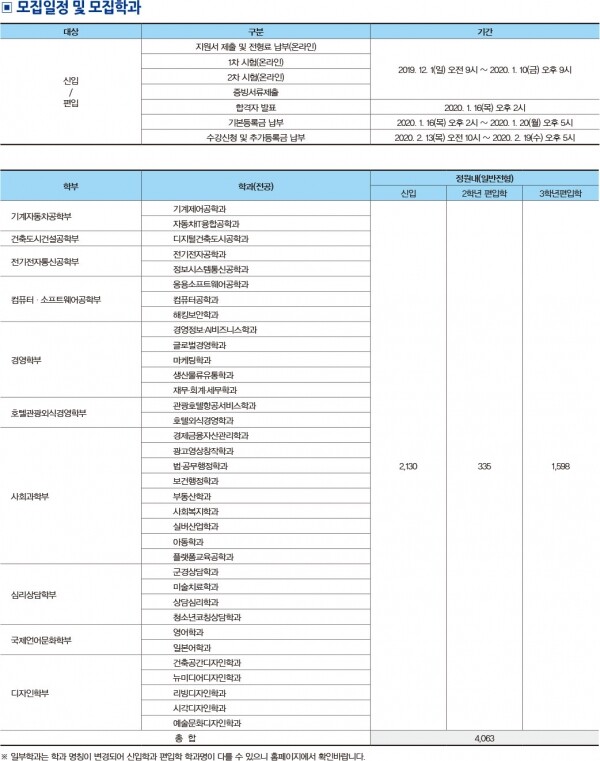 인문사회계열은 경영정보·AI비즈니스학과, 글로벌경영학과, 마케팅학과, 생산물류유통학과, 재무·회계·세무학과, 관광호텔항공서비스학과, 호텔외식경영학과, 경제금융자산관리학과, 광고영상창작학과, 법·공무행정학과, 보건행정학과, 부동산학과, 사회복지학과, 실버산업학과, 아동학과, 플랫폼교육공학과, 군경상담학과, 미술치료학과, 상담심리학과, 청소년코칭상담학과, 영어학과, 일본어학과), 디자인계열(건축공간디자인학과, 뉴미디어디자인학과, 리빙디자인학과, 시각디자인학과, 예술문화디자인학과가 개설되어 있다.