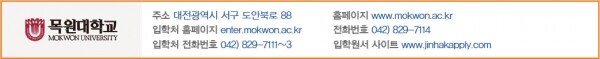 목원대는 1954년 중부권 최초로 설립된 기독교 명문사학으로서 새로운 비전과 가치로 미래를 준비하는 대학이다. ▲2019 교육부 대학혁신지원사업 선정 ▲2019 교육부 지역선도대학 육성사업 선정 ▲2018 한국대학교육협의회 대학기관평가 인증 ▲2017 고용노동부 IPP형 일학습병행제 사업 선정 ▲교육부 외국인유학생 유치·관리 인증기관 선정 ▲특허청 지식재산 교육 선도대학 선정 ▲고용노동부 4차 산업혁명 선도 훈련기관 선정 ▲교육부 교육기부 진로체험 인증기관 선정 등 다양한 사업 선정으로 수험생 여러분을 맞이할 준비가 되어 있는 대한민국 명문사학이다.