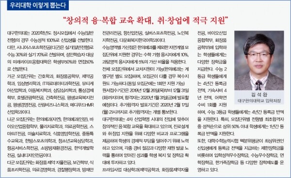 대구한의대학교(총장 변창훈)는 지속적인 혁신과 특성화를 통해 대학 경쟁력을 강화해 왔으며 이러한 노력의 결과, 사회맞춤형 산학협력 선도대학(LINC+) 육성사업과 대학혁신지원사업에 각각 선정됐다.