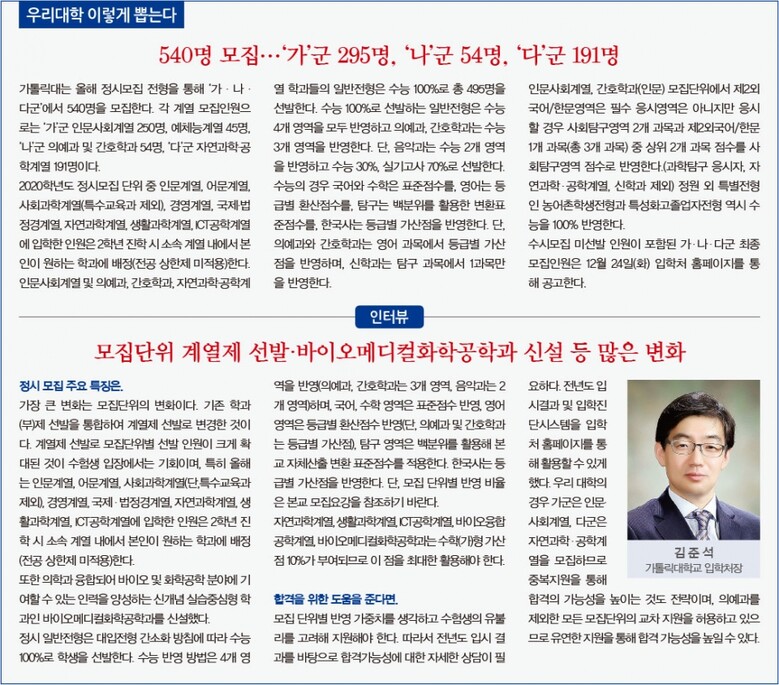 가톨릭대는 올해 7월 교육부와 한국연구재단 선정평가에 따라 ‘4차 산업혁명 혁신선도대학’으로 선정됐다. 지난 2017년부터 ‘사회맞춤형 산학협력 선도대학(LINC+) 육성사업’ 등 굵직한 국책사업의 성공적인 수행을 바탕으로 대학에 인문사회 산학협력 모델을 정착시켰다는 평가를 받고 있다. 또한, 교육 내실화와 학부모 입시 부담 경감을 위한 대입 전형 개선에도 앞장서 ‘고교교육 기여대학 지원사업’에도 6년 연속 선정되는 등 대학 역량과 입시경쟁력 강화를 위한 강점분야를 집중 육성하고 학부편제 혁신을 통해 생명 중심의 교육과 연구를 선도하기 위해 힘쓰고 있다.