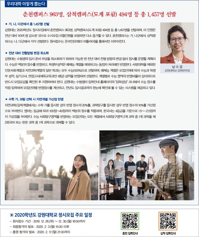 올해 개교 72주년을 맞이한 강원대학교(총장 김헌영)는 ‘실사구시(實事求是)’의 건학이념을 바탕으로 ‘실사구시형 창의·협동 인재’를 길러내는 학생 중심 교육을 강조하며, ‘통일한국의 중심대학’을 핵심비전으로 ‘2030년 세계 100대 대학’을 향해 도약하고 있다. 낮은 교육비 부담, 높은 취업률, 캠퍼스별 특성화를 바탕으로 창의적이고 특성화된 글로벌 리더를 양성하고 있다.