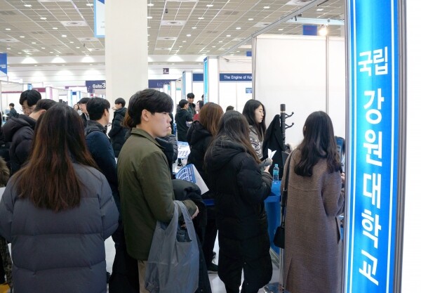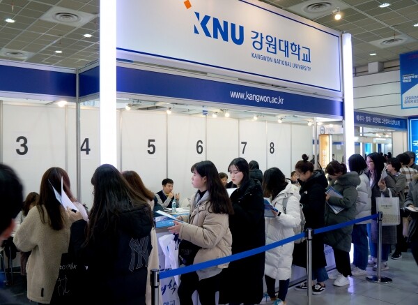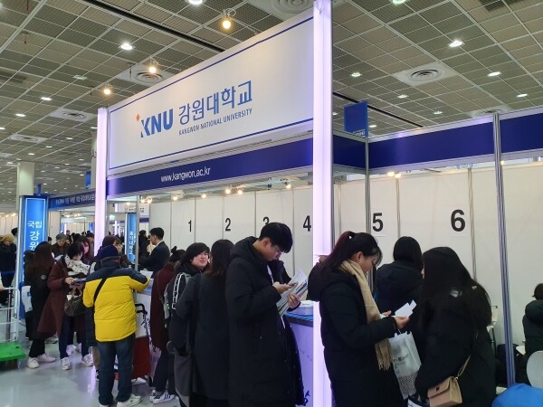 [대학저널 백두산 기자] 한국대학교육협의회가 주최하는 '2020학년도 정시 대학입학정보박람회'(이하 정시박람회)가 5일부터 7일까지 서울 삼성동 코엑스 1층 A홀에서 열린다. 이번 정시박람회에는 전국 135개 대학이 참가한다. 현재 수험생과 학부모들이 발 디딜 틈 없이 몰리는 등 현장 열기가 뜨겁다. 사진은 강원대학교 상담부스 모습.