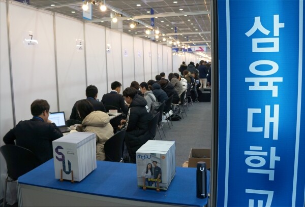 [대학저널 백두산 기자] 한국대학교육협의회가 주최하는 '2020학년도 정시 대학입학정보박람회'(이하 정시박람회)가 5일부터 7일까지 서울 삼성동 코엑스 1층 A홀에서 열린다. 이번 정시박람회에는 전국 135개 대학이 참가한다. 현재 수험생과 학부모들이 발 디딜 틈 없이 몰리는 등 현장 열기가 뜨겁다. 사진은 삼육대학교 상담부스 모습.