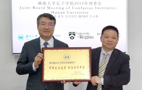 ‘호남대-중국 후난대 공자아카데미 2019 이사회’와 ‘2019 세계공자아카데미대회’ 참석차 중국을 방문 중인 박 총장은 9일 중국 후난성 후난대학에서 차오셩위안(曺升元) 후난대학 부서기로부터 ‘한중교류대사 양교협력중추’라는 문구가 새겨진 공로패를 수상했다.