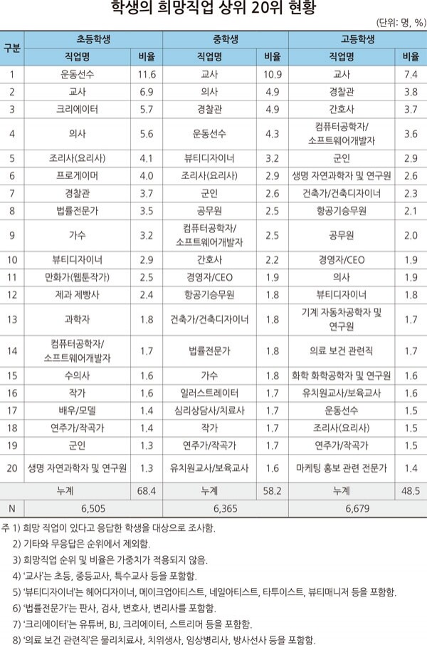 작년 초등학생 희망직업 5위를 차지했던 ‘크리에이터’는 올해 두 계단 상승한 3위를 차지했다. 1위는 ‘운동선수’, 2위는 ‘교사이며 작년 3위였던 ’의사‘는 4위로 밀려났다. 5위는 ’조리사(요리사)‘가 차지했다.