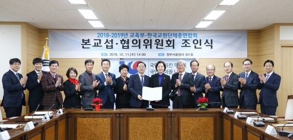 교육부와 한국교원단체총연합회(교총)는 11일 정부서울청사에서 '2018~2019년 본교섭·협의위원회(조인식)'를 개최하고 이같은 내용을 담은 '교섭·협의 합의서'에 서명했다.