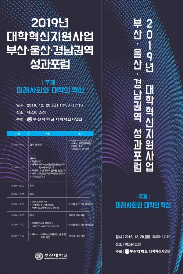 [대학저널 임지연 기자] 부산대학교(총장 전호환) 기획처 대학혁신사업단(단장 기획처장 김석수)은 오는 20일 오전 10시부터 부산 웨스틴조선호텔 2층 주니어 볼룸(Junior Ballroom)에서 대학혁신지원사업의 우수성과를 발굴·공유하고 참여 대학 간 교류와 발전 방향을 모색하는 ‘2019년 대학혁신지원사업 부산·울산·경남권역 성과포럼’을 개최한다.