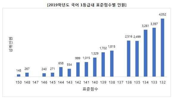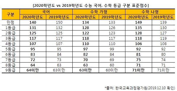 수능 영역별 최고점은 국어 140점, 수학(가)형 134점, 수학(나)형 149점으로 나타났다. 전년대비 국어는 10점 하락하고, 수학(가)형은 1점 상승한 것에 비해 수학(나)형은 무려 10점이나 상승했다. 표준점수는 해당 시험의 평균, 표준편차 등을 통해 산출되고, 시험이 까다로울수록 높게 형성된다는 특징이 있다. 전년대비 표준점수 10점 상승은 올해 수학(나)형이 수험생들에게 어렵게 다가왔음을 단적으로 보여준다.