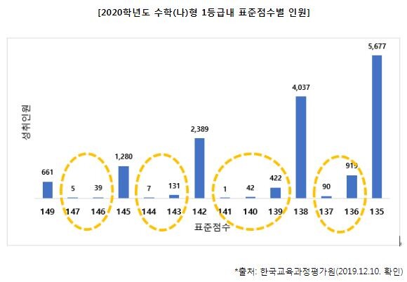 작년의 경우, 매우 까다로웠던 국어 영역이 정시에서 인문/자연계열 모두에게 영향력이 컸다. 이런 역할을 올해에는 수학(나)형이 맡게 될 것으로 보이며, 더 크게 작용할 수도 있다. 국어의 경우에는 표준점수 1점 사이사이에 수험생들이 촘촘히 분포해 있지만, 수학은 점수차이가 3~4점 단위로 이뤄지는 경우가 많기 때문이다.