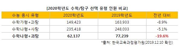일반적으로 자연계열 모집단위를 희망하는 학생들은 수학(가)형과 과학탐구를 선택하고, 인문계열 모집단위를 희망하는 학생들은 수학(나)형과 사회탐구를 선택한다. 하지만 이와 같은 선택을 하지 않고 수학(나)형과 과학탐구를 선택하는 학생들이 상당 수 있다. 이런 학생들은 대부분 6월 모의고사 등으로 만족스러운 수학 성적을 얻지 못해서 수학(가)형 대신 수학(나)형으로 영역을 바꾼 학생들이다. 올해 학령인구 감소에 따라서, 수능 선택의 모든 조합에서 응시생 감소가 있었지만 수학(나)형+과탐 응시생의 하락폭은 매우 크다. 따라서 이 학생들이 자연계열 모집단위로 전략적으로 지원할 수 있는 국민대, 숭실대, 성신여대 등 대학의 경쟁률은 전년에 비해 하락할 개연성이 크고, 입시결과에도 일정 부분 영향을 미칠 것으로 보인다.