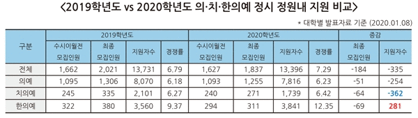 2020학년도 의·치·한의예 정시는 정원 내 1,837명 모집에 1만 3,396명 지원으로 7.29대 1의 지원율을 보였다. 2019학년도 2,021명 모집 1만 3,731명 지원, 6.79대 1과 비교해 모집인원은 184명 줄고, 지원은 335명 감소했다. 의·치·한의예 지원자 감소율은 전년대비 -2.44%로 수능 응시 인원이 지난해보다 -8.58%(4만 5,483명) 감소한 것에 비하면 매우 적었다. 지원율 상승이 보여주듯 2020학년도 정시에서 최상위권 수험생들의 의·치·한의예 선호는 더 강하게 나타났다.