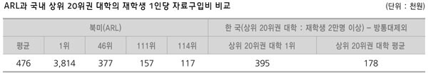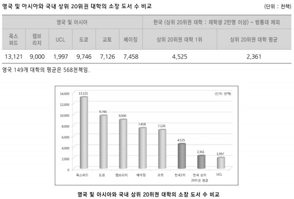 국내 상위 20위권 대학(재학생 2만명 이상)의 재학생 1인당 평균 자료구입비는 17만 9,000원원은 영국의 캠브리지(74만 3,000원), 옥스퍼드(63만 9,000원), 그리고 일본의 도쿄(72만 1,000원)보다 현저히 적고, 영국의 UCL(43만 7,000원)과 일본의 교토(43만 1,000원)보다 2배 이상, 중국의 베이징(33만 4,000원)보다 1.5배 이상 적은 금액이었다.