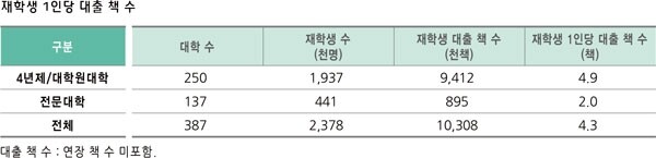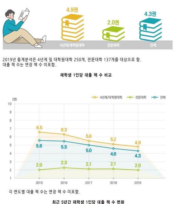 재학생 1명이 1년간 대출하는 도서는 4.3책이었다. 4년제/대학원대학은 4.9책, 전문대학은 2.0책으로 4년제 대학의 40.8%에 불과했다.