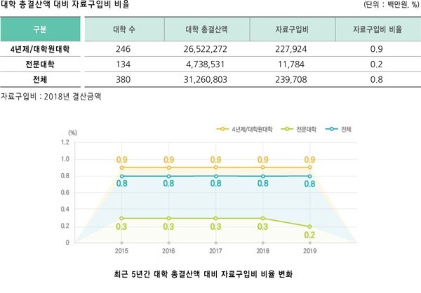 자료집에 따르면, 대학 총결산액 대비 자료구입비의 비율은 0.8%였다. 4년제/대학원대학은 0.9%로 평균보다 약간 높았지만 전문대학은 0.2%에 불과했다.