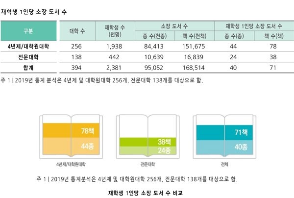 재학생 1인당 소장 도서는 40종, 71책으로 2018년보다 소폭 늘었다. 4년제/대학원대학은 44종, 78책, 전문대학은 24종, 38책으로 대학도서관진흥법 시행령 기준(재학생 1인당 전문대학 30책 이상, 전문대학 이외 대학 70책 이상)보다 약간 높았다.