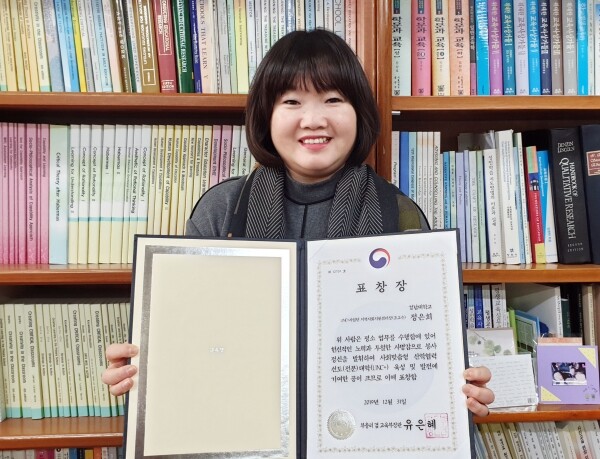 [대학저널 임지연 기자] 경남대학교(총장 박재규) 교육학과 정은희 교수가 최근 ‘2019년 사회맞춤형 산학협력선도대학(LINC+) 육성사업’의 지역사회협력 및 혁신 공헌 공적분야에서 업무유공자로 인정받아 부총리 겸 교육부장관 표창장을 수여받았다.