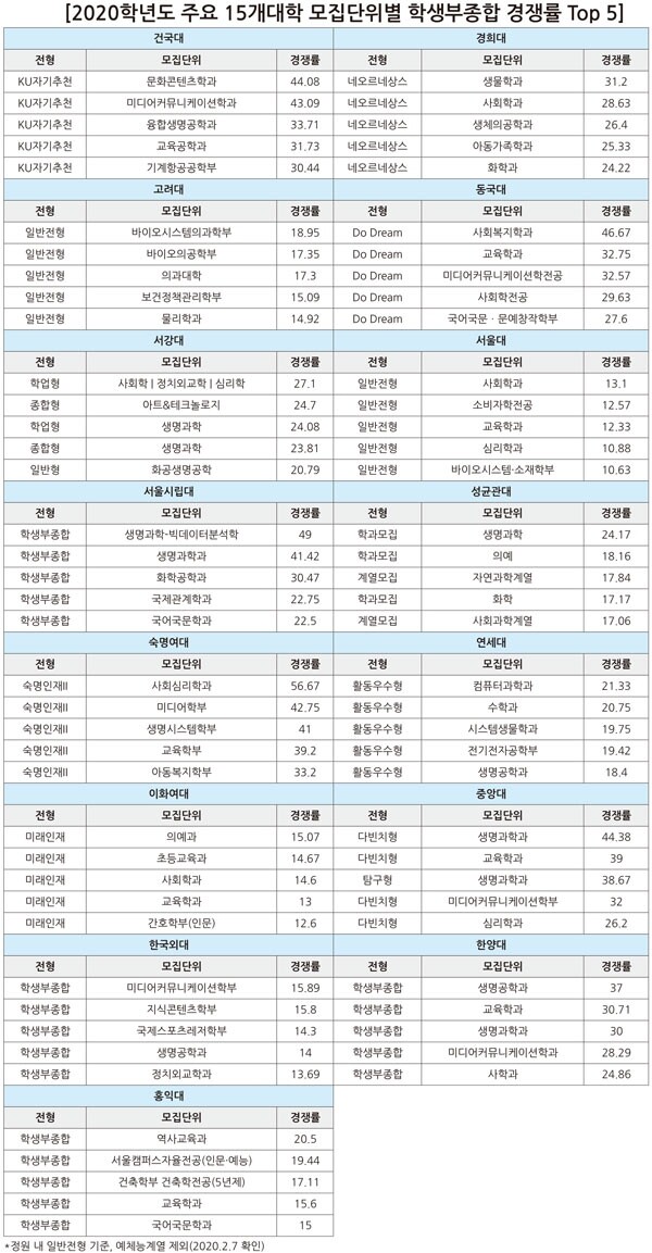 [대학저널 백두산 기자] 학생부종합전형(이하 학종)은 수험생이 고교 3년간 어떤 경험과 노력을 해왔는지에 대해 학생을 평가한다. 학생들은 평소 가지고 있는 관심과 선호도를 기준으로 학교 생활을 꾸려 나가고 이를 바탕으로 대학에 지원하기 때문에, 학종 경쟁률을 살펴보면 어떤 모집단위가 높은 선호도를 가지고 있는지 확인할 수 있다. 또, 이런 선호도는 매년 유사하게 전개되므로 올해 어떤 모집단위의 경쟁률이 높을지 미리 예상해 볼 수도 있다.