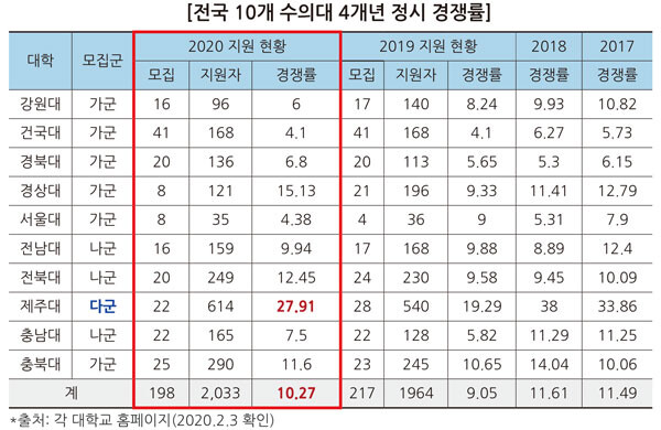 올해 정시에서 가장 경쟁률이 높았던 대학은 제주대 수의예과로 22명 모집에 614명이 지원했다(27.91대 1). 전국 10개 대학 수의예과 정시 평균 경쟁률(10.27대 1) 보다 세 배 가까이 높다.